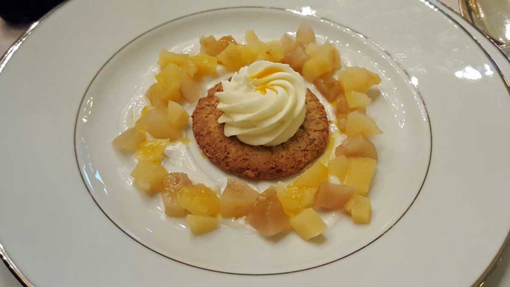 “Simplicity” – Orange flavoured milk double cream, pear, apple, sauce of almond from Noto, lemon biscuit, saffron drops from L’Aquila