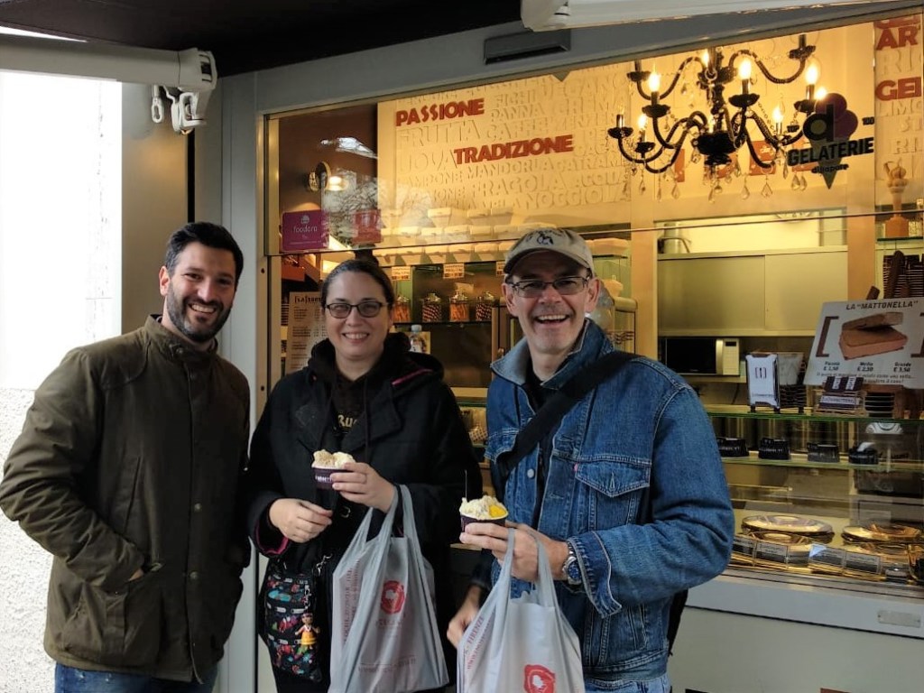 On the Saturday, I took George Gensler (one of the founders of Manhattan Chocolate Society in New York, and an ICA grand jury judge) and Meybol Vadillo Moran (owner of Meybol Cacao) to Gelateria La Sorbettiera – We met up with Antonio, the owner of this brilliant ice-cream place. I had to give Antonio a jar of our soy caramel sauce since we forgot to bring him one earlier in the year when we met him, and of course we had to try some of his delicious gelato.