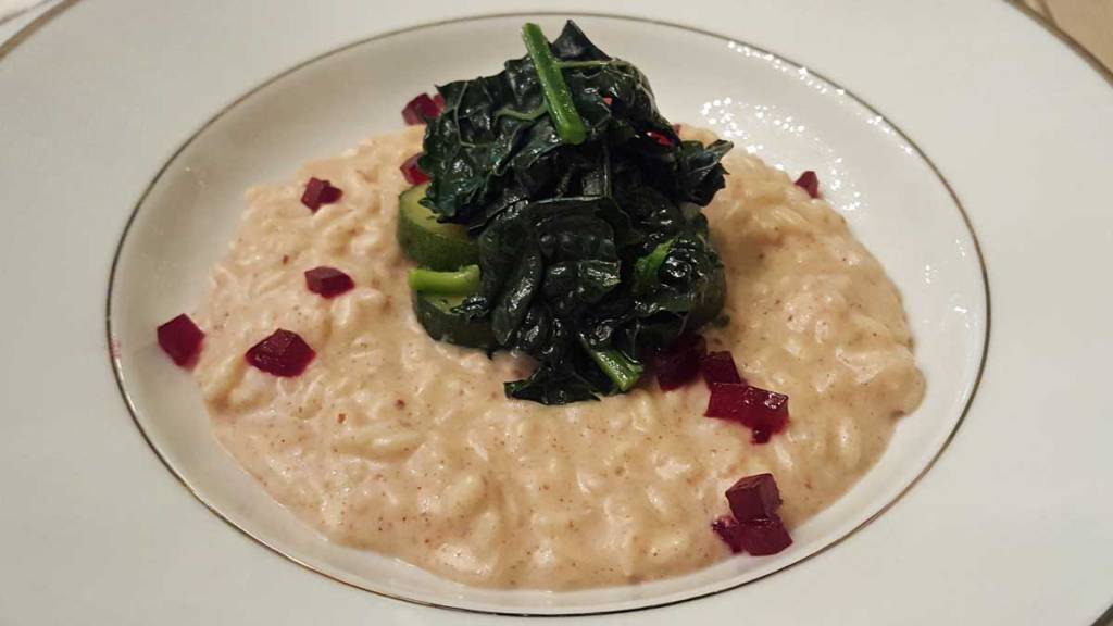 “Fantasy” – Risotto with almond from Noto, crunchy courgette, black cabbage and beetroot
