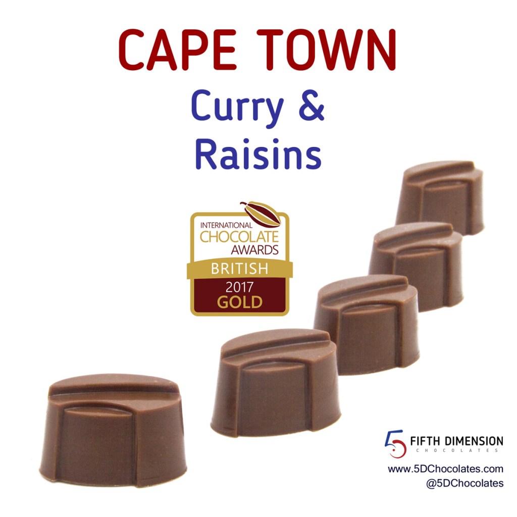 This year we are adding two new chocolates to our filled chocolates collection. If you haven’t noticed already, each filled chocolate in our collection is named after a city in the world. Many of our chocolates are based on flavours inspired by our travels around the world. The first new flavour this year, curry and raisin, is called Cape Town.
